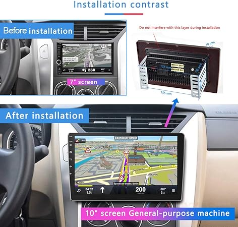 - Head Unit Size: 250x145x40mm, double din installation. 10 inch big screen, capacitive touch. High revolution supports 1080P ultra clear video. 2.5D arc edge anti-scratch tempered glass screen. With dual USB, video output/input RCA ports.