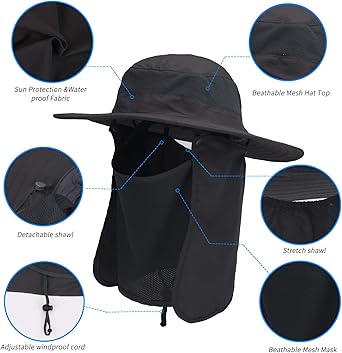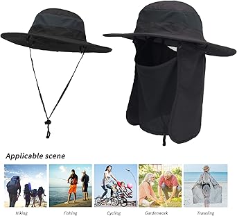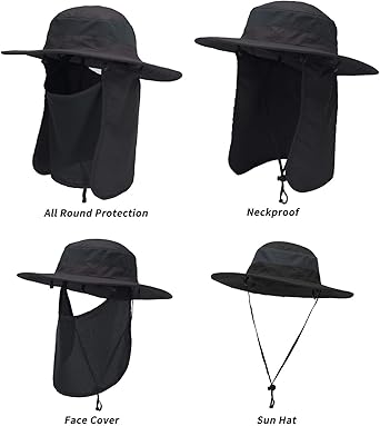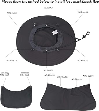- 360° SUN PROTECTION:Our hat,wide brim,face & neck flaps (flaps are removable),keep the sun off you head,face and neck.Double windproof design with adjustable chin strap and buckle in neck flap ensures the hat stays put even in windy or rainy conditions.