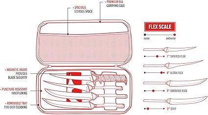 - VERSATILE: Includes 4 different full-tang blades, 8" Ultra Flex, 7" Tapered Flex, 9" Stiff & 9" Serrated Blade, allowing you to switch between blades quickly and seamlessly