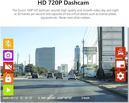 - 【HD 720P Dashcam】 The Eonon 720P HD dashcam records high-quality and smooth video day and night at 30 frames per second and captures all the critical details such as license plates, signposts etc. Never miss what matters!