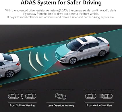 - 【ADAS System for Safer Driving】 With the advanced driver-assistance systems(ADAS), the camera sends real-time audio alerts if you stray from the lane or drive too close to the front vehicle. It helps to avoid collisions and accidents and create a safer and better driving experience.