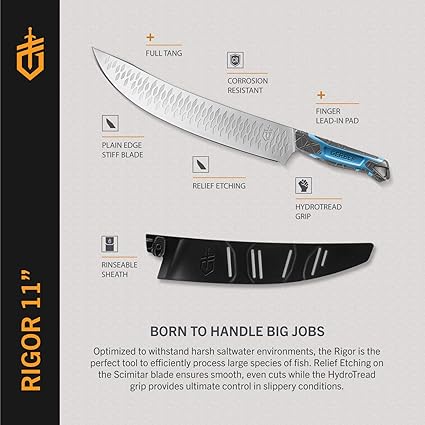 - Unique curved scimitar style blade helps to efficiently process and steak large species of fish
