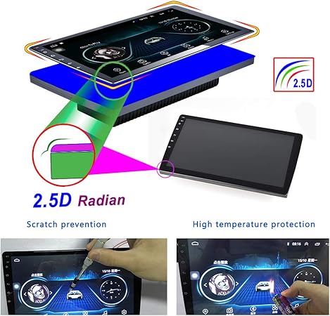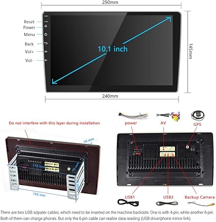 - 【2 Din Car Stereo】 main screen size: 250(W)*145(H)mm. With metal sheet fixed on, installation size: 180(W)*75(H)*70(D)mm. 10.1 inch 2.5D tempered glass mirror. With double USB adapter input, RCA output/input port