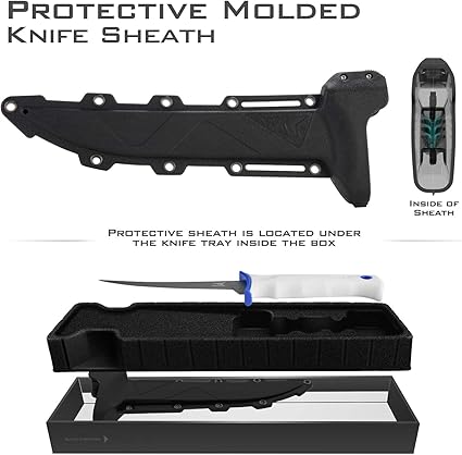 - Protective Molded Knife Sheath – Each knife includes a light-weight and durable sheath to protect your blade and provide a safe storage option for your knife. Unlike fabric cases that retain water and cause corrosion, our molded case allows water to drain from the case and air flow to circulate which keeps blades in top notch condition between uses.