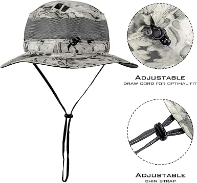 - ADJUSTIBLE FIT – This one-size fits all hat can be adjusted with the elastic draw string inside the head band and locked in place with the rear mounted toggle button. An adjustable chin strap ensures your hat will not be lost on a windy day.