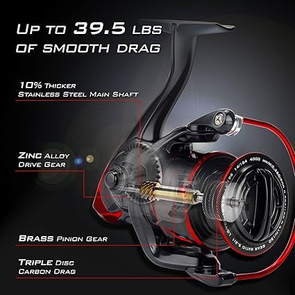 - PURE POWER - You will love Sharky III spinning reel's amazing best-in-class up to 39.5LBs / 18KG of smooth, reliable triple disc carbon fiber drag, oversized stainless-steel main shaft, and stronger precision mesh manganese brass pinion gears for more fishing muscle.