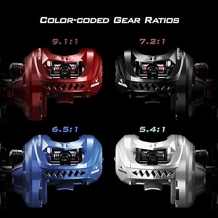 - Color-coded system - Casting has given the mega jaws unique colors for each gear ratio so you can quickly identify the right reel for the job. Select from 5. 4: 1, 6. 5: 1, 7. 2: 1 and 9. 1: 1.