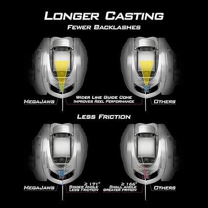 - Mega jaws - inspired by the Most powerful Sea predator, The Casting Mega Jaws bait casting fishing reel conveys essential shark elements that represent the power and strength.