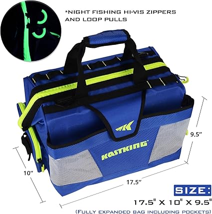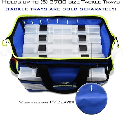 - EASY TO ORGANIZE – The TB71 tackle bag is perfect for transporting fishing gear. A large wide-mouth main compartment offers easy access to your tackle and holds up to (4) 3700 size tackle box trays (not included, but available separately from KastKing) and an external easy-access pocket can hold (1) 3700 size tackle box allowing you to quickly find your favorite bait. External end pockets offer space to store smaller items such as bags of bait, hooks, cell phone, wallet, or other items.