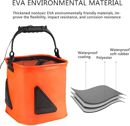- EVA ENVIRONMENTAL MATERIAL: Thickened nontoxic EVA environmentally friendly materials, improve the flexibility, impact resistance and corrosion resistance. Unfolded size: 23cm*23cm*24cm (9inch*9inch*9.5inch) Bucket weight: 508g Rope weight: 62g Total weight: 570g Rope length: 6 meters Capacity: 13 L/3.43Gal.