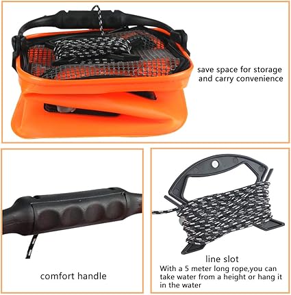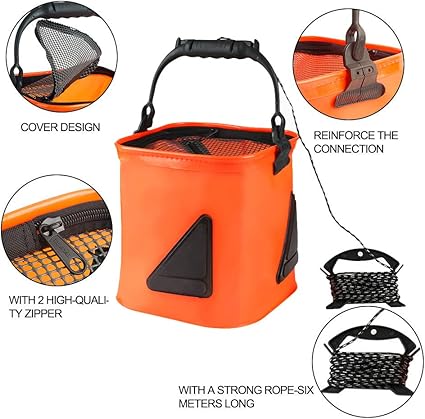 - FOLDING DESIGN: The bucket has filter mesh with the high-quality zipper, you can store live bait while fishing. With a strong rope , you can also take water at a height of 6 meters, suitable for any fishing enthusiasts, collapses for easy storage,say goodbye to fatigue of travel!