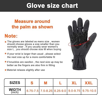 - Size Tips: The gloves are labeled as men's size, women should choose gloves a size smaller than you normally wear. If you usually wear women's size L, you should choose size M when buying. Please measure around your palm before selecting a size by using the sizing chart in the product image. If you are in-between sizes, please select the larger size for a more comfortable fit.