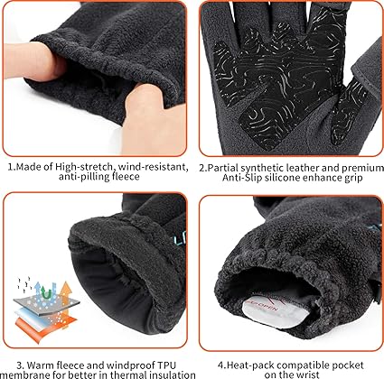 - Warm Your Hands: Made of wind-resistant, soft high-stretch fleece. Anti-pilling fabric prevent these gloves from fraying or pilling. Heat-pack compatible pocket on the wrist add warmth without interfering with dexterity.