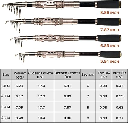 - Stainless Steel Hooded Reel Seat is anti-seawater corrosion; EVA Fore Grip for comfort. The telescopic fishing rod is portable, and closed length design is convenient carrying around. Power: Medium.