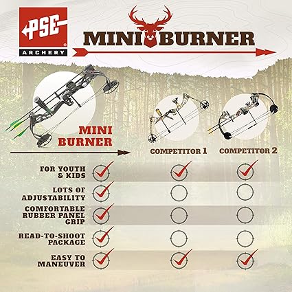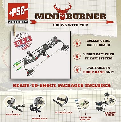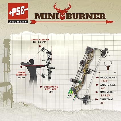 - A GREAT COMPOUND HUNTING BOW - Shoot for years to come using the PSE Mini Burner Youth Compound Bow. The highly adjustable draw length range grows with any young archer! Light enough to hold while carrying at your side during the first hunt!