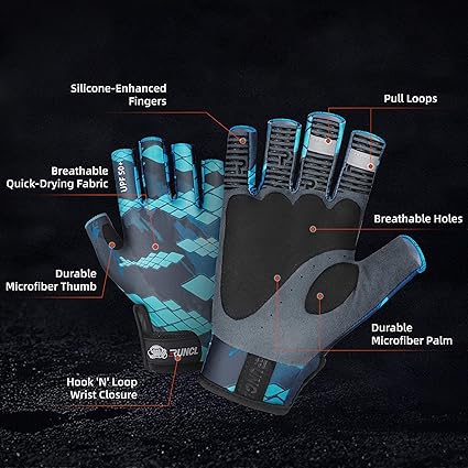 - Half-Finger Style: The fingerless fishing gloves leave the tips of your fingers free, provide you with sensitive touch and rigging dexterity when you're tying knots, rigging bait, handling fish and other fishing tasks