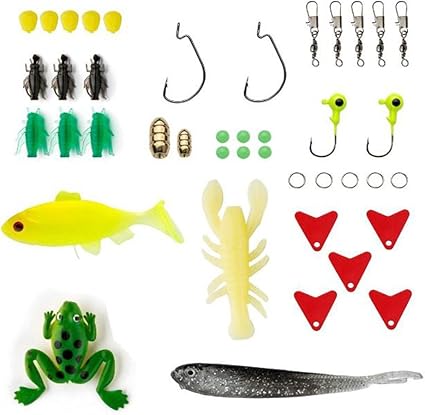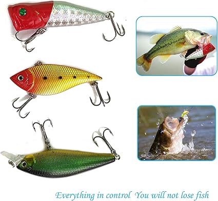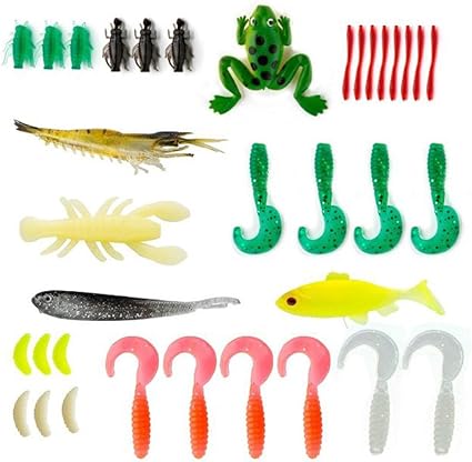 - This set contains 6 different baits:Crankbaits 1pcs,VIB 1pcs, Topwater Lures 1pcs, Plastic Worms 33pcs,Jigs 5pcs, fish-shaped soft bait 2pcs,simulation of shrimp 2pcs. All lures are widely used and carefully selected,meet the needs of different varieties of fish you catch. Other accessories 32 pcs.Bouth of them are very lifelike and swim well.