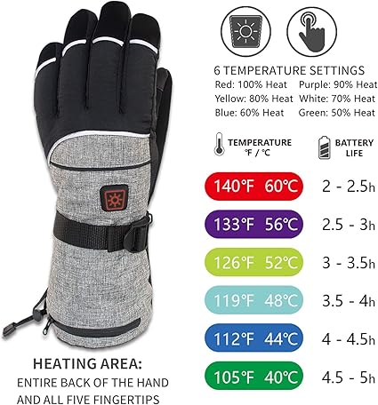 - 【LONG WORKING HOURS】: Powered by 7.4V/2200mAh Lithium battery, large capacity of battery can let the heated gloves working time up to 4.5 hours(fully charged).To make it work more efficient, click the highest setting let it work for about 5 - 10 mins and then switch to lowest setting to save more battery life.