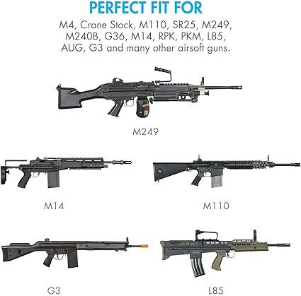 - THE IDEAL AIRSOFT GUN BATTERY - Fits popular models of airsoft guns like M4, Crane Stock, M110, SR25, M249, M240B G36, M14, RPK, PKM, L85, AUG, G3, G36C, M4A1-RIS, M4A1, CAR15, MP5A5, MC51, FNP90, AUGRT, AUGM, G3A4, G36, STEYR and others. For upgraded and/or modified AEGs, we recommend measuring the gun compartment for best fit.