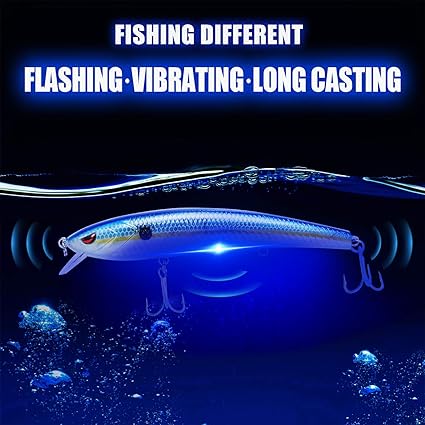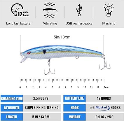 - 【HIGH SIMULATION】Equipped with Mustad treble hooks to provide maximum hooking capability which makes it a powerful fishing tool. 3D painted high quality lure is sure to provide superior performance . When they were halved out of the water, after the lure is dry, the lure’s buzzed and light functions are off.