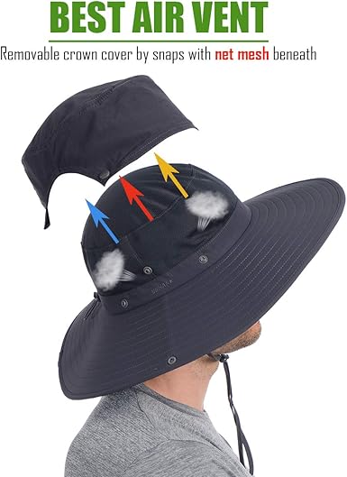 - 【 UPF 50+ UV Protection 】High-tech fabrics were used, UPF 50+ sun protection to keep delicate skin on the neck ears and face safe from harmful rays, dual crown with net mesh inside and fabric cover outside, free removal by snaps, great air vent and breathable fabrics. In addition to a removable crown top, it protects face, neck skins from the sunshine. Great value hat blocking out more than 98% of the sun harmful UV rays