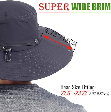 - 【 Product information 】Material: 100% Nylon fabric, Size: One Size Adjustable 22.6" -23.22"(7 1/8-7 2/5)/ (56.8-60 cm),Super Wide Brim 4.72”/12cm, Net Weight: About 7.05 Ounces /200g( Very Light), Feel: Soft and Comfortable, Ultraviolet Protection Factor(UPF): >50,Other Features: Windproof, Water Showerproof, Quick Drying, Breathable, Removable Safari Hat UPF 50+ Sun Protection Hat Boonie Hat Cap