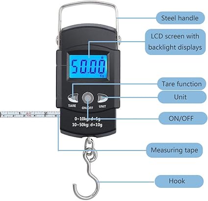 - Accuracy and High Capacity: Digital fish scale with ruler weighs up to 110 lbs/50 kg; Below 10Kg, accurate to 1/100 pounds or in whole ounce increments, the scale will also be in KG units, accurate to 5g. Above 10Kg, accurate to 2/100 pounds or in whole ounce increments, the scale will also be accurate to 10g;