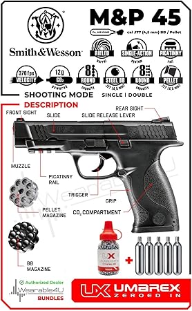 - IN THE BOX: Smith & Wesson M&P 45 CO2 .177 BB/Pellets Air Pistol, 5 pcs of 12gr CO2 Tanks (x5), 1x 8rds Pellet Mag (x1), 1x 8rds BB Mags (x1) and Pack of 1500 .177 Steel BBs